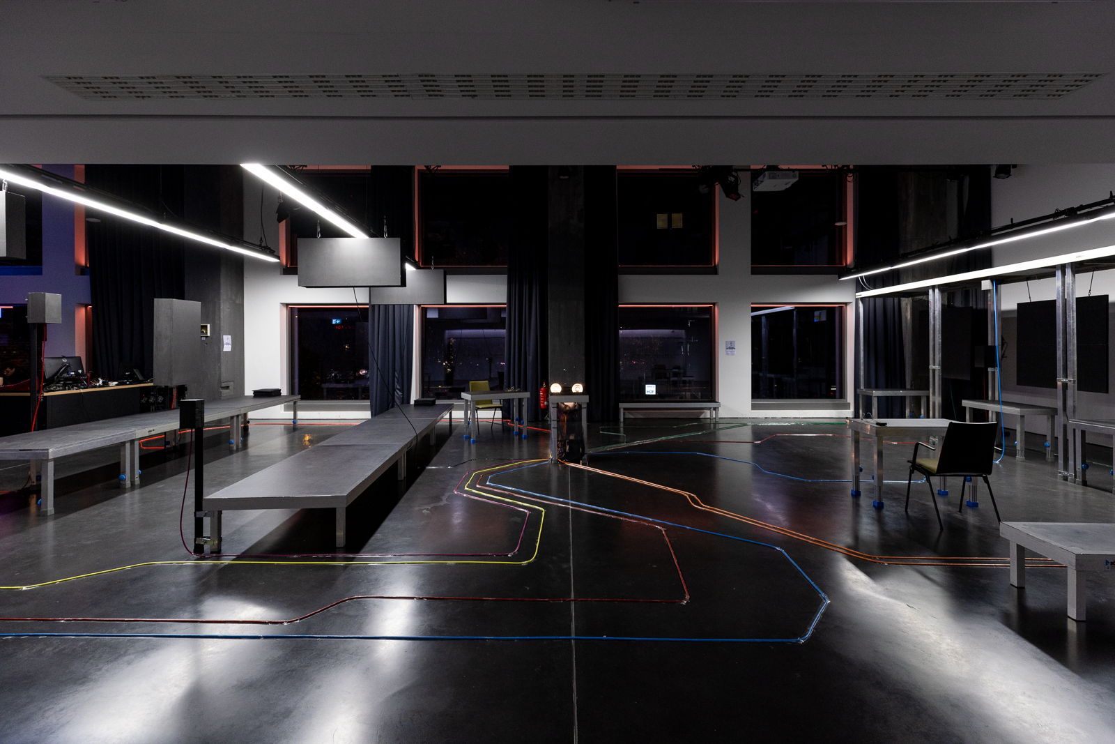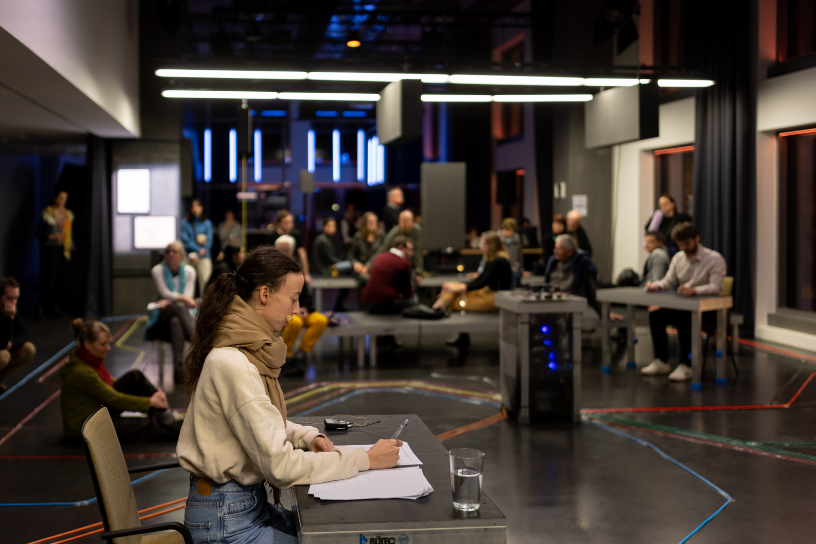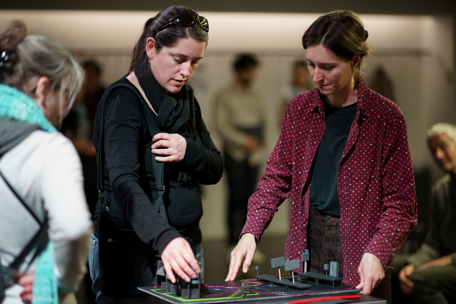 mius Recherchen münden in ein Präsentationsformat, das zum Erleben der Schichten einlädt, die sich im Stadtraum überlagern: Die dort erforschten taktilen, auditiven und visuellen Elemente werden im Foyer des FFT Düsseldorf in eine Stadtraumszene übersetzt. Hier fließen szenografische Gestaltung und dem öffentlichen Raum entlehnte Klänge, haptische Eindrücke und künstlerische Audiodeskription zusammen. Drei Vortragende mit unterschiedlichen Perspektiven auf städtische Mobilität fügen inhaltliche Impulse hinzu. Der Einbezug von Dolmetscher:innen für Französisch und Japanisch erweitert die Klang- und Rauminstallation um eine weitere Ebene.