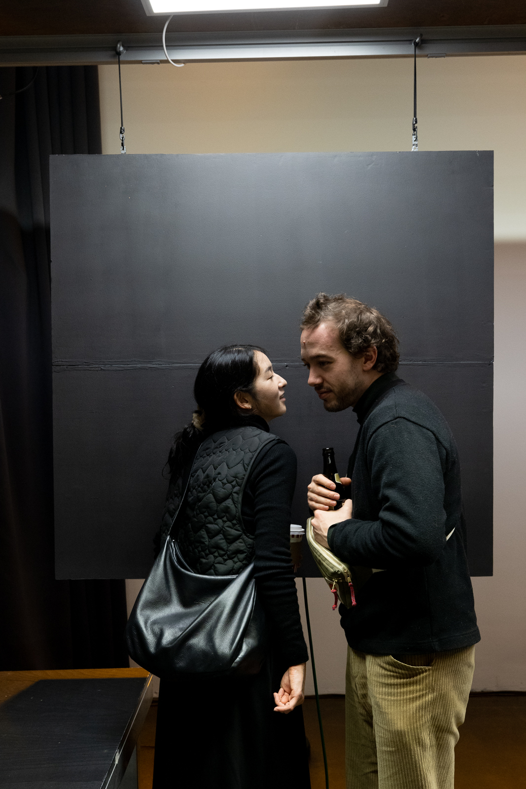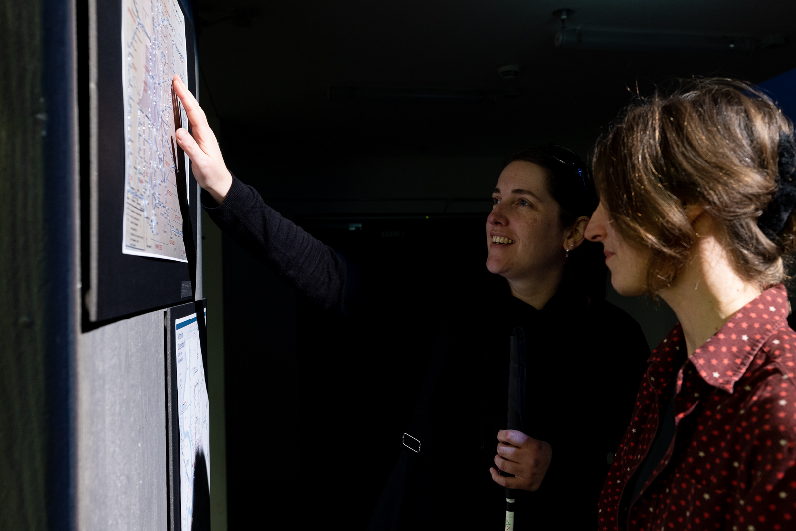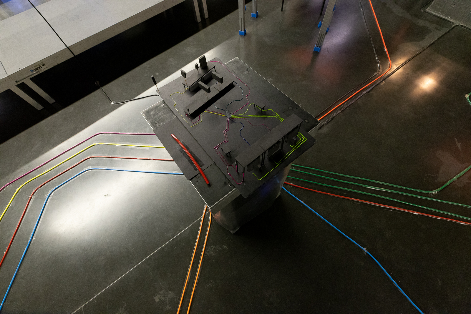 mius Recherchen münden in ein Präsentationsformat, das zum Erleben der Schichten einlädt, die sich im Stadtraum überlagern: Die dort erforschten taktilen, auditiven und visuellen Elemente werden im Foyer des FFT Düsseldorf in eine Stadtraumszene übersetzt. Hier fließen szenografische Gestaltung und dem öffentlichen Raum entlehnte Klänge, haptische Eindrücke und künstlerische Audiodeskription zusammen. Drei Vortragende mit unterschiedlichen Perspektiven auf städtische Mobilität fügen inhaltliche Impulse hinzu. Der Einbezug von Dolmetscher:innen für Französisch und Japanisch erweitert die Klang- und Rauminstallation um eine weitere Ebene.