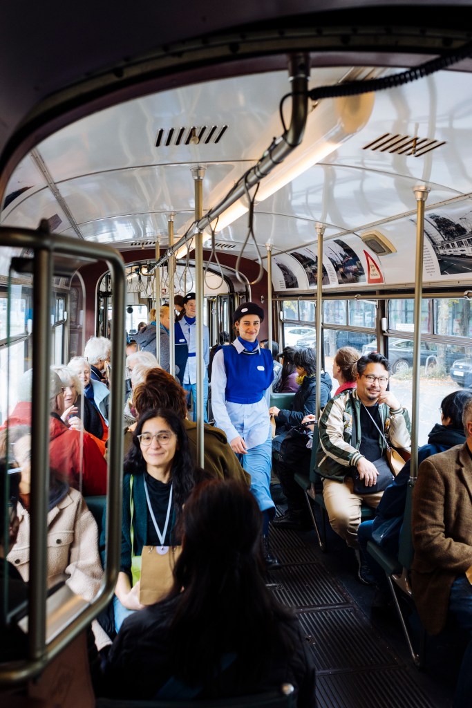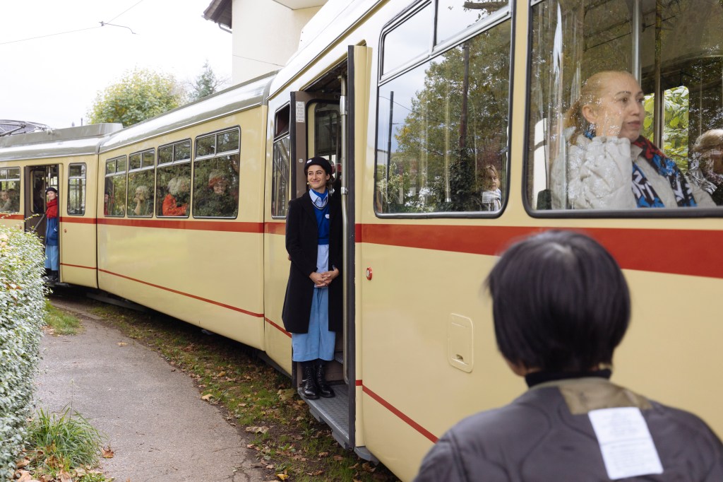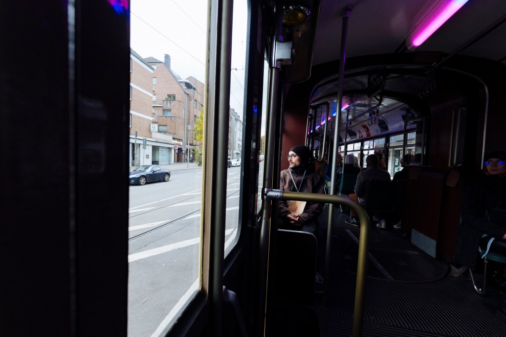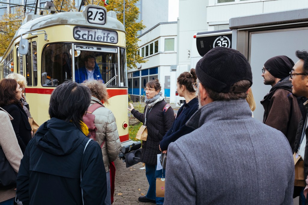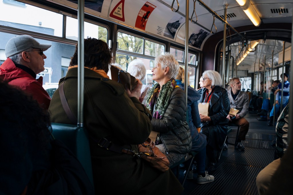 Der Konzeptkünstler miu und sein Team laden zu einem performativ-installativen Ausflug ein. Los geht es im Theaterfoyer, dann steigt das Publikum in einen historischen Straßenbahnwagen und fährt an einen speziell inszenierten Ort im Stadtraum (und wieder zurück). Unterwegs eröffnen sich ungewöhnliche Perspektiven auf Bewegung in der Stadt: Alltägliche Fortbewegungsmethoden verwandeln sich in heimliche Choreografien, bekannte Geräusche und die Stimmen der drei Performerinnen verdichten sich zu akustischen Warteräumen. Der Ort des Transits wird zum Ort des Verweilens, zukunftsgerichtete Wartezeit wird zur Erkundung des Jetzt. Es gibt eine offene Audiodeskription, die für nichtsehendes wie sehendes Publikum den Raum, Bewegungen und unsichtbare Verknüpfungen in Worte fasst, und die zum Teil der Klanglandschaft wird. Als Teil zwei der Trilogie „train train“ wird das Projekt in Kooperation mit der Arbeitsgemeinschaft historischer Nahverkehr Düsseldorf e.V. „Linie D“ und der Rheinbahn realisiert.