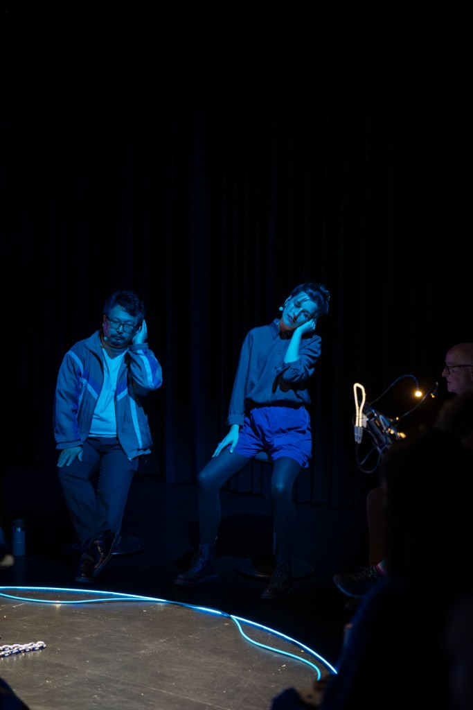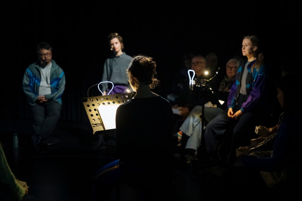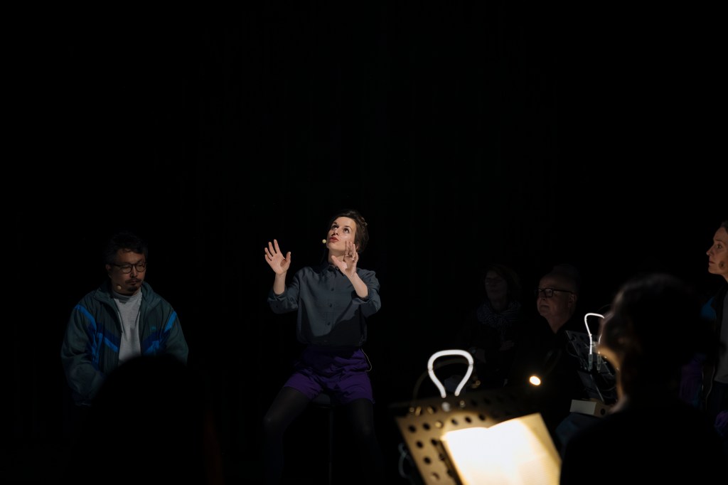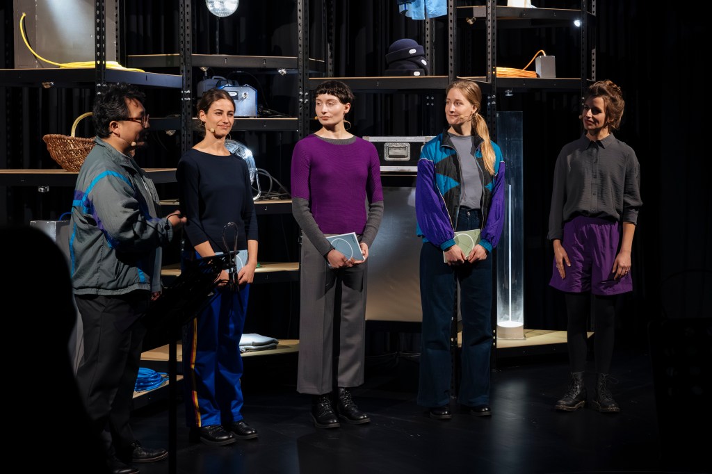 Es begleitet das Publikum durch eine imaginäre Stadtszene. Kleine Musikmaschinen entwickeln darin ihren eigenen Rhythmus. Sie treten in einen Dialog mit literarischen Fragmenten und Stimmen der Performerinnen und Dolmetscher:innen, die auf Deutsch, Französisch und Japanisch Erinnerungen teilen. Die eingebundene künstlerische Audiodeskription und ihre Übersetzung öffnen den Abend für vielfältige Perspektiven und Assoziationen.