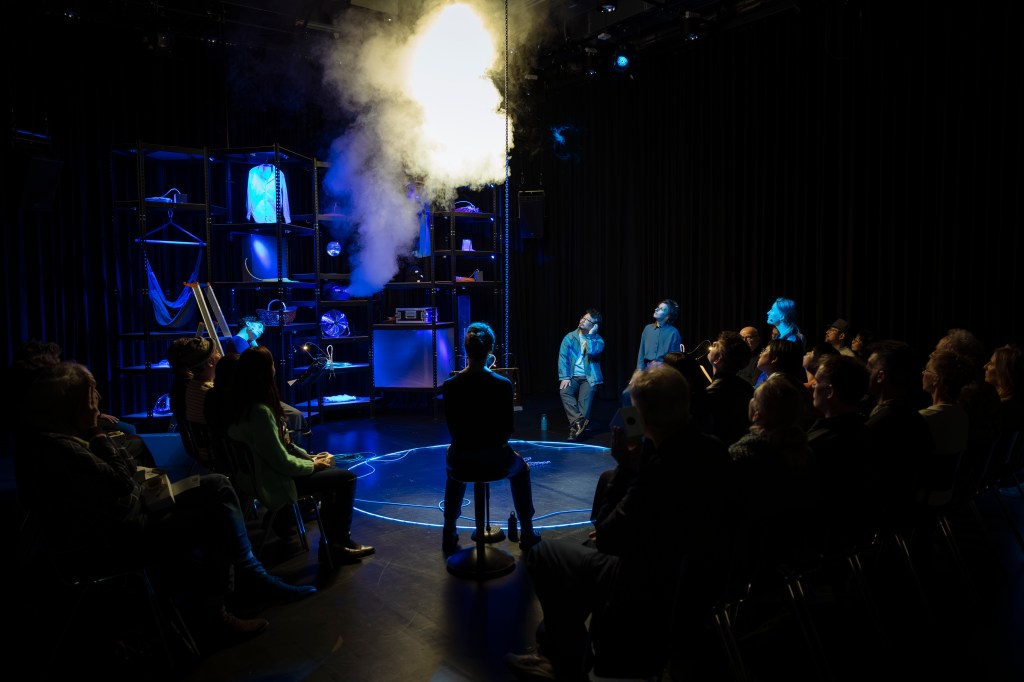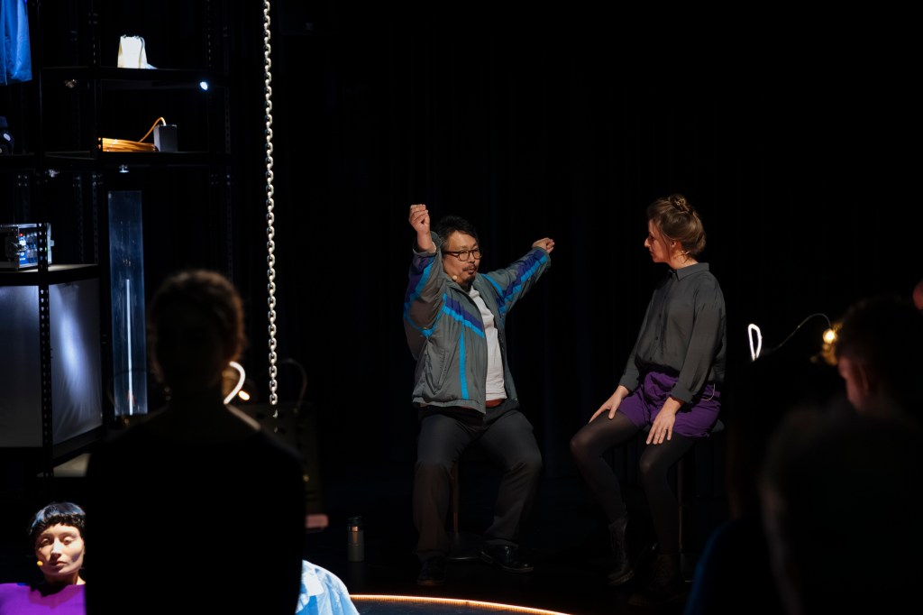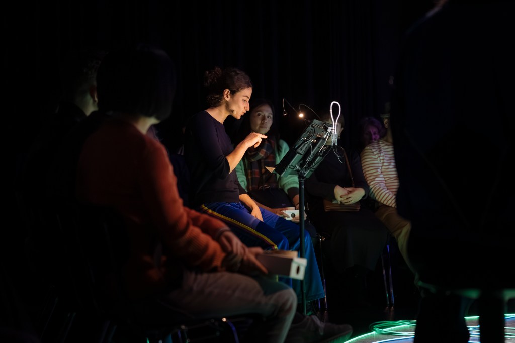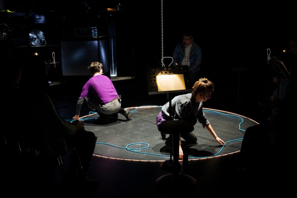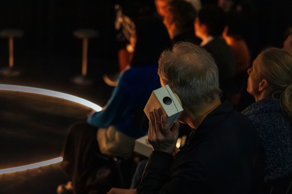 Es begleitet das Publikum durch eine imaginäre Stadtszene. Kleine Musikmaschinen entwickeln darin ihren eigenen Rhythmus. Sie treten in einen Dialog mit literarischen Fragmenten und Stimmen der Performerinnen und Dolmetscher:innen, die auf Deutsch, Französisch und Japanisch Erinnerungen teilen. Die eingebundene künstlerische Audiodeskription und ihre Übersetzung öffnen den Abend für vielfältige Perspektiven und Assoziationen.